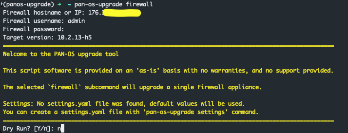 From my terminal where my virtual environment is now activated I start of my upgrade by typing in pan-os-upgrade firewall. After that, I specify additional parameters as shown in the screenshot below: